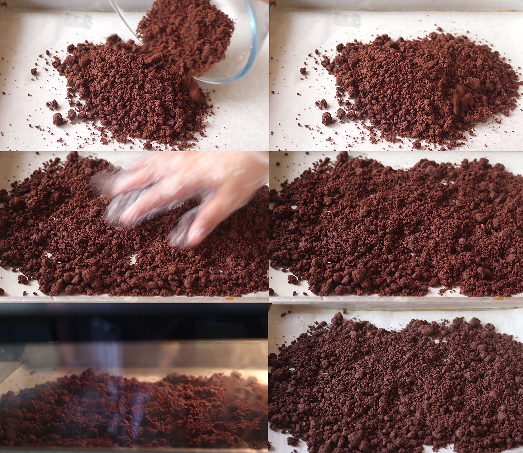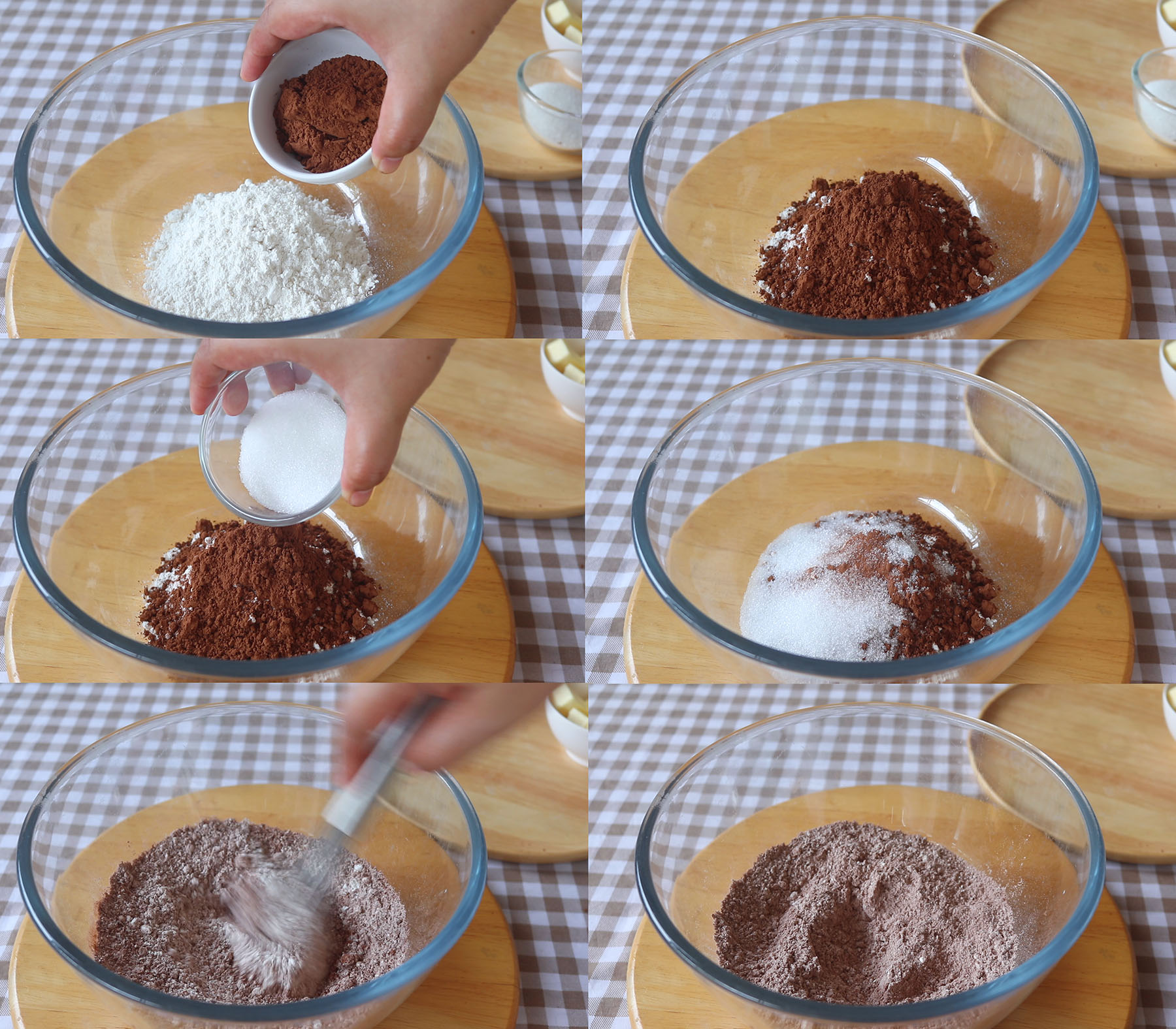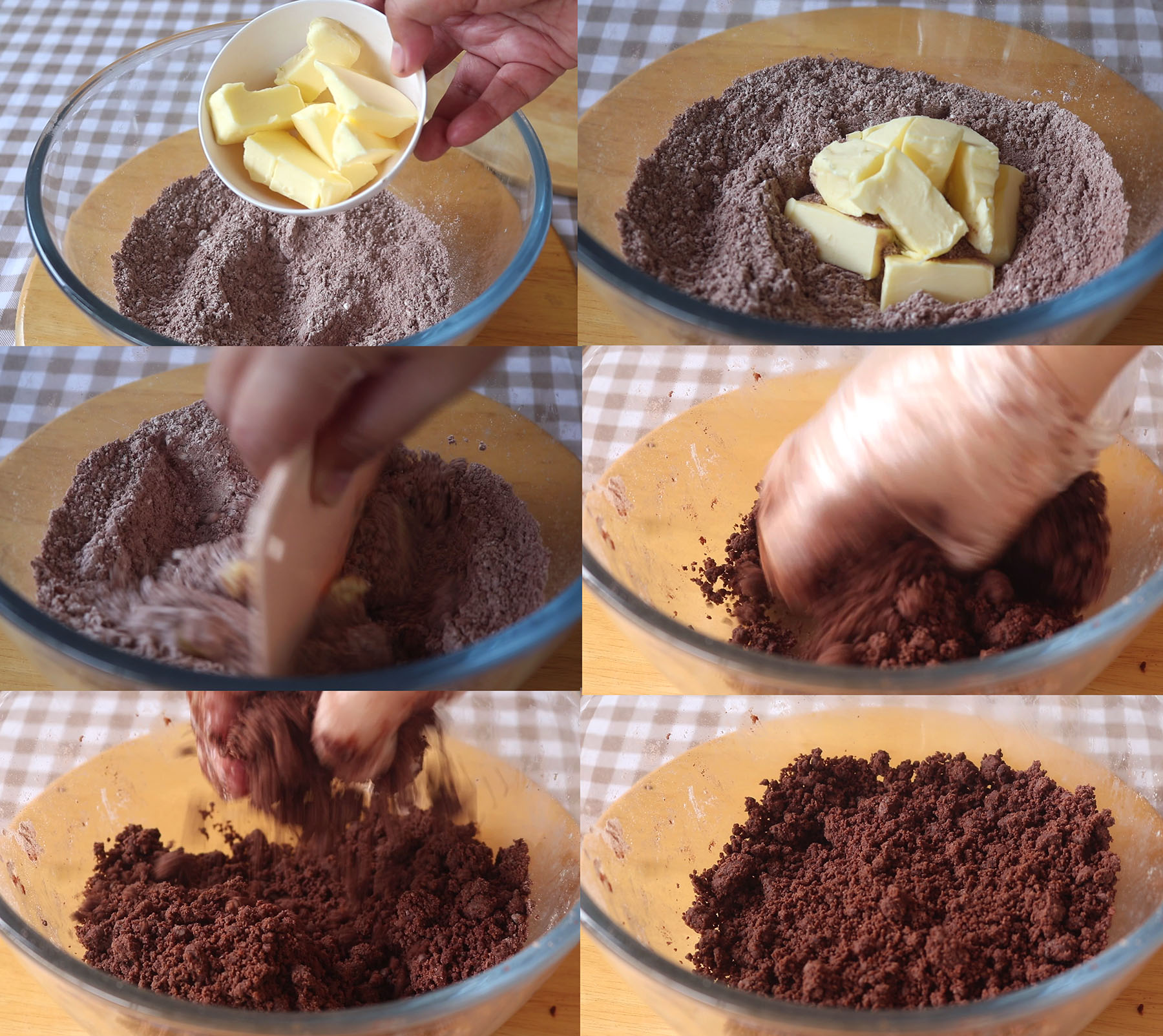7. ทำครัมเบิ้ลช็อคโกแลตสำหรับโ ร ย บนข น ม ค่ะ ผสมแป้งสาลีอเนกประสงค์+ผงโกโก้+น้ำต าลทราย