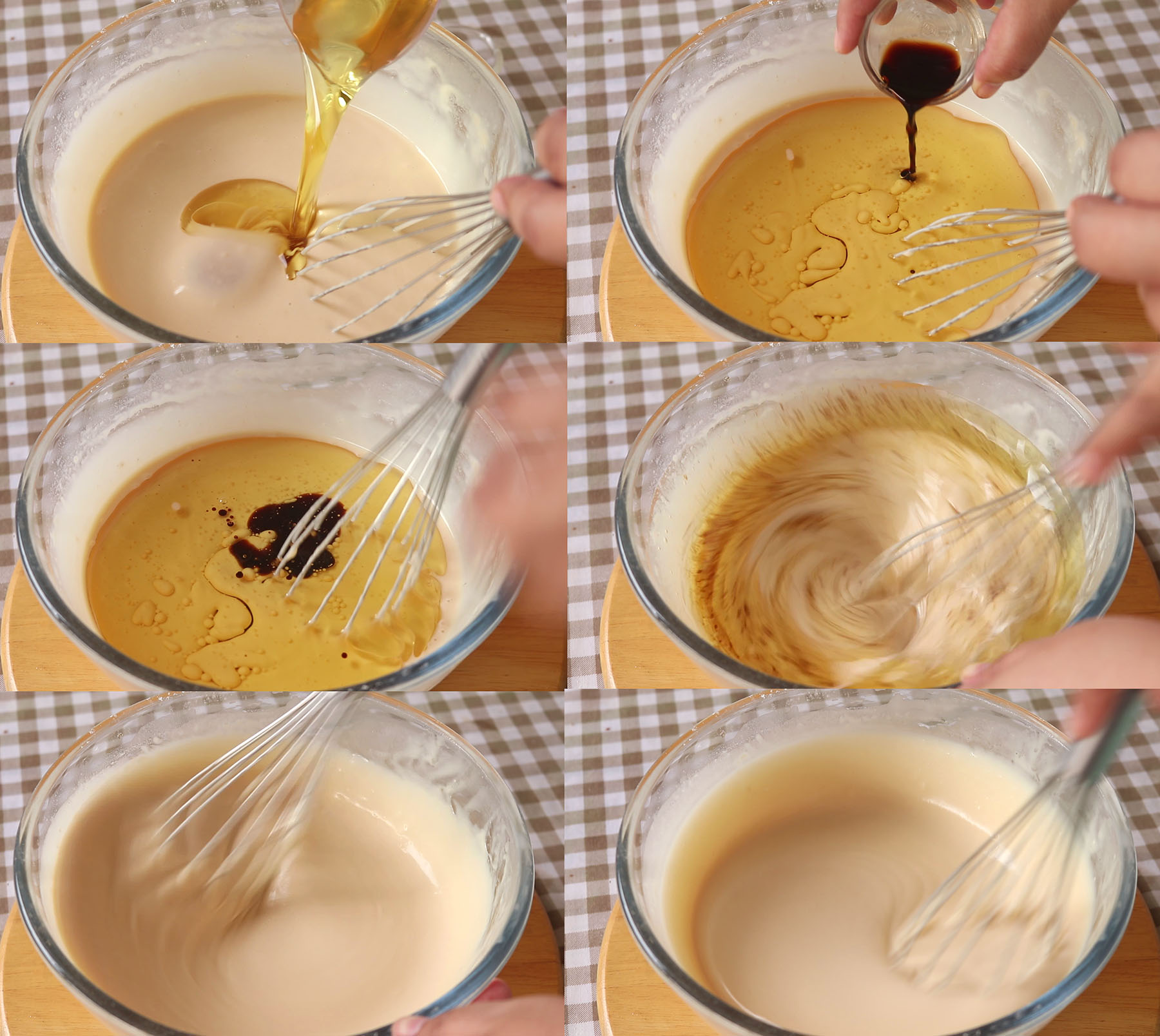 4.เ ทน้ำมั น รำข้าวและวานิลลาลงไปคน จ นส่ ว นผ ส ม เนียนเข้ากัน