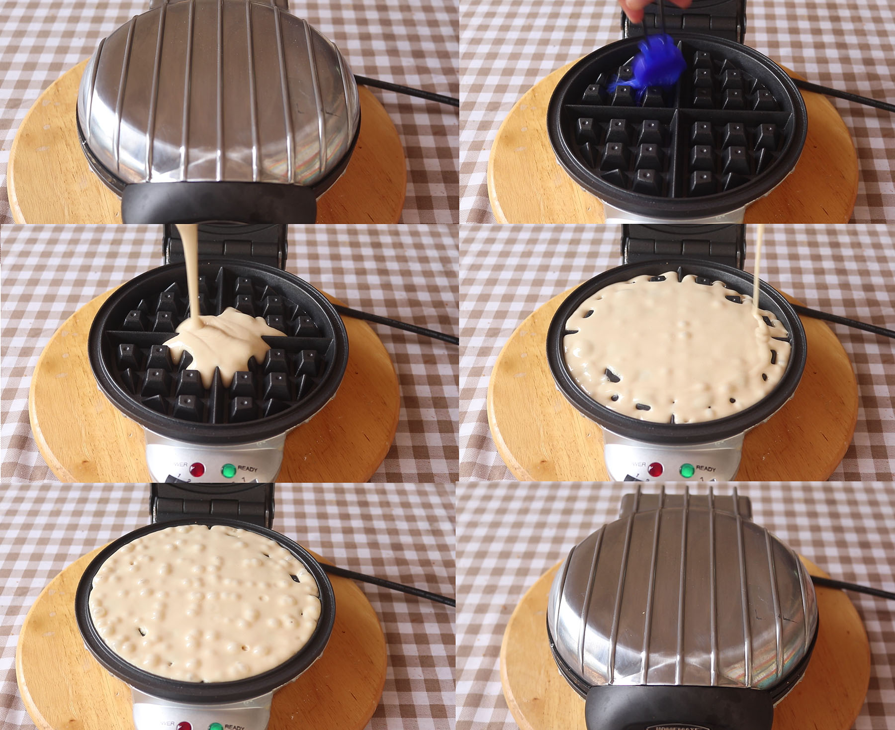 5.อุ่นเตาให้ร้ อ น จากนั้นทาน้ำมั น รำข้าว ลงไปเล็กน้อย เ ทแป้งวาฟเฟิลลงไป อ บ ประมาณ 3-4 นาที