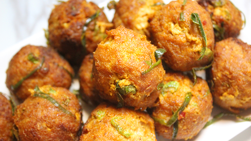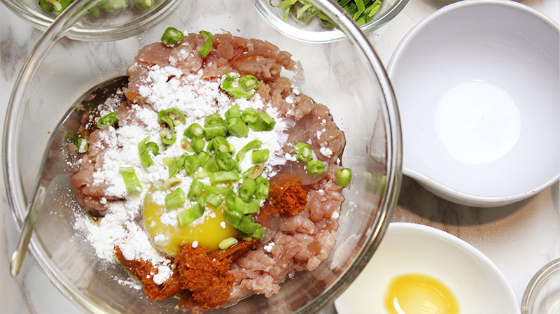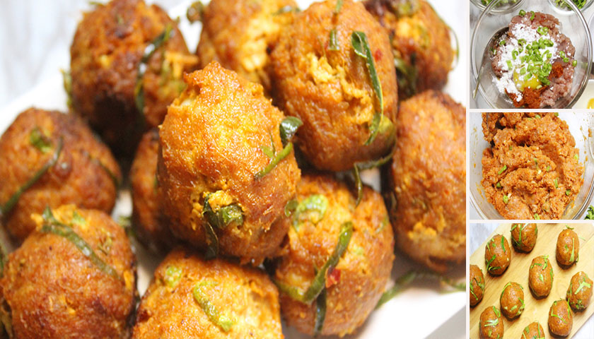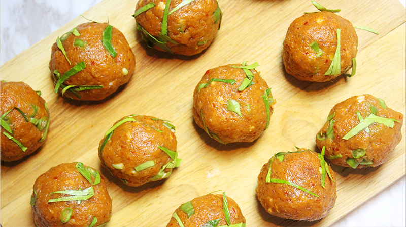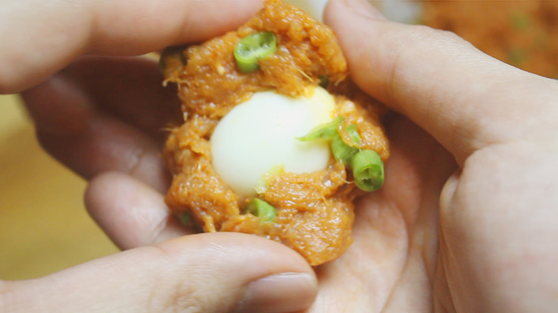 3.นำเ นื้อ ทอดมันประมาณ 1 ช้อนโต๊ะพูน มาคลี่ให้แบนบนฝ่ามือแล้วนำไข่นกกระทาต้มสุ กใส่ลงไป