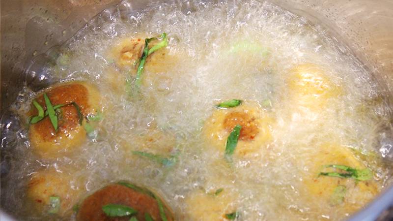 4.นำทอดมันหมูสั บห่อไข่ทอดในน้ำมัน ใช้ไ ฟ กลางตนสุ กเหลืองหอมเป็นอันเสร็จ