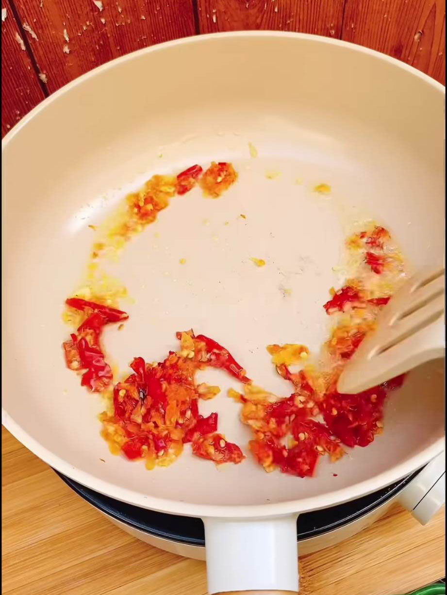 3.ตั้งกระทะ ใส่น้ำมัน ตามด้วยพริกที่ตำไว้