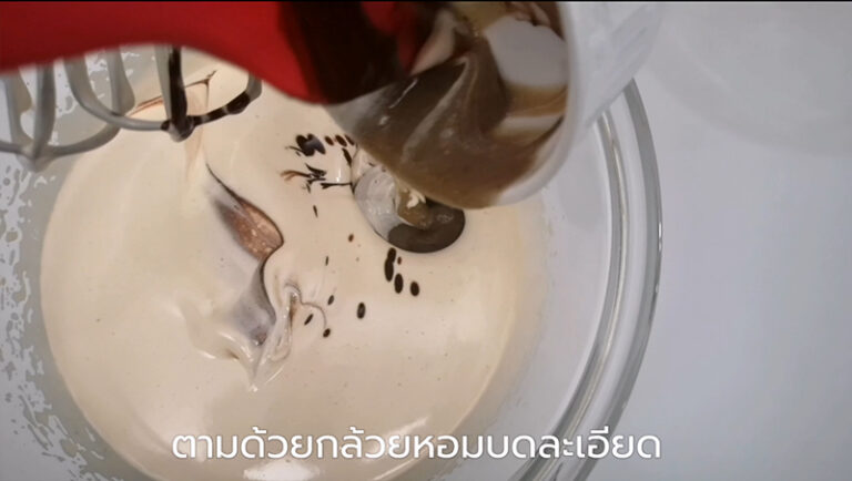 – จากนั้นตีสปีดปานกลางประมาณ 5 นาที จนส่วนผสมฟู