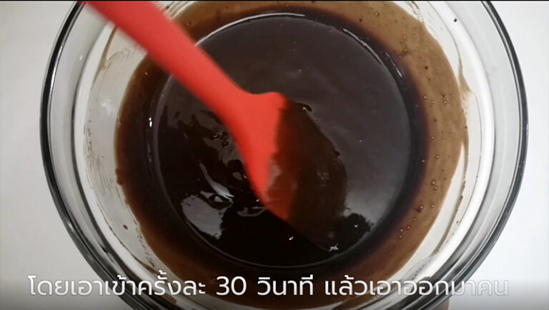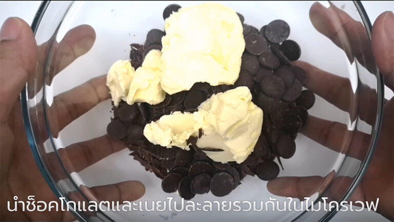 – นำเนยจืดกับช็oกโกแลตไปละลายในไ มโ ครเ ว ฟ โดยเอาเข้าครั้งละ 30 วินาที แล้วเอาออกมาคน