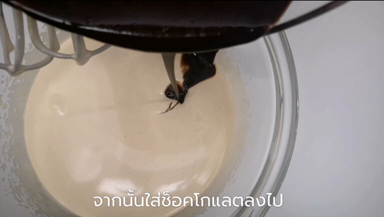 – จากนั้นใส่ช็oกโกแลตที่ละลายไว้แล้วลงไป