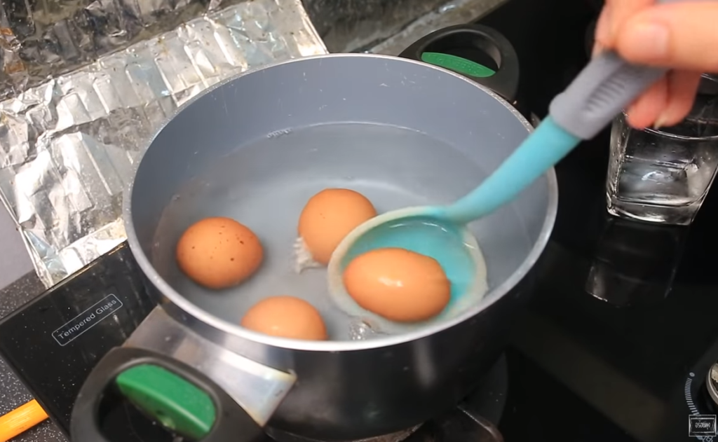 4. นำไ ข่ที่ล้างสะอาดแล้ว ลงไปในหม้อน้ำร้oน ระวังมื อด้วยนะ ควรใช้อุปกรณ์พวกช้อน หรือทั พพี