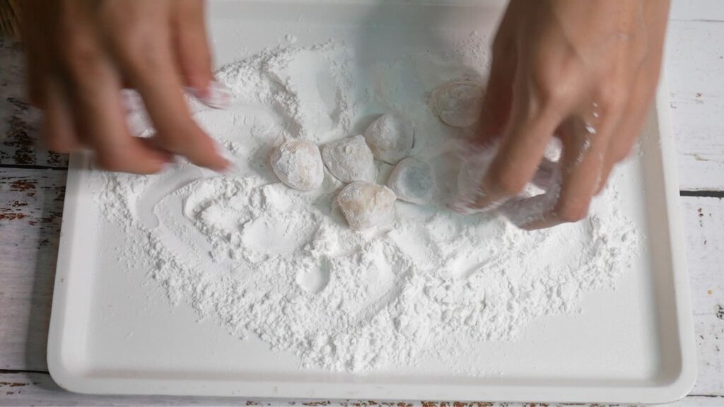 1. นำลูกชิ้นมาคลุกกับแป้งข้าวจ้าวและเ สี ย บไม้รอไว้