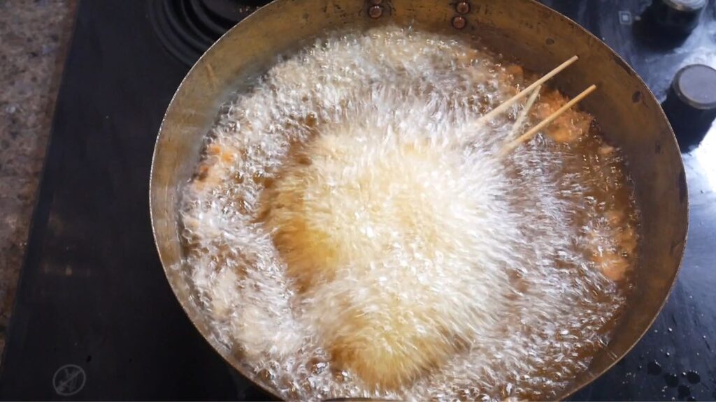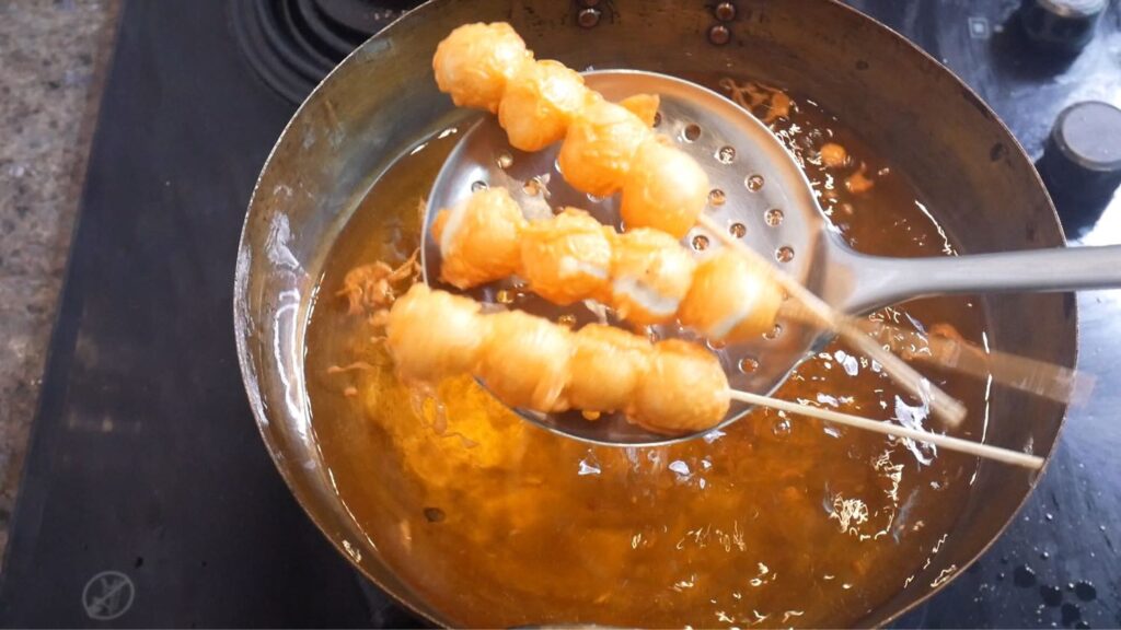 3. ตั้งกะทะให้น้ำมัuร้oนใช้ไ ฟปานกลาง-แรง เมื่อน้ำมัuร้oนแล้วนำลูกชิ้นที่เ สี ย บไม้ไว้ชุบแป้งที้ราทำไว้และทoดให้เหลืองกรอบ