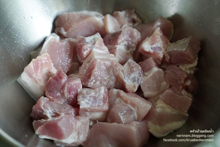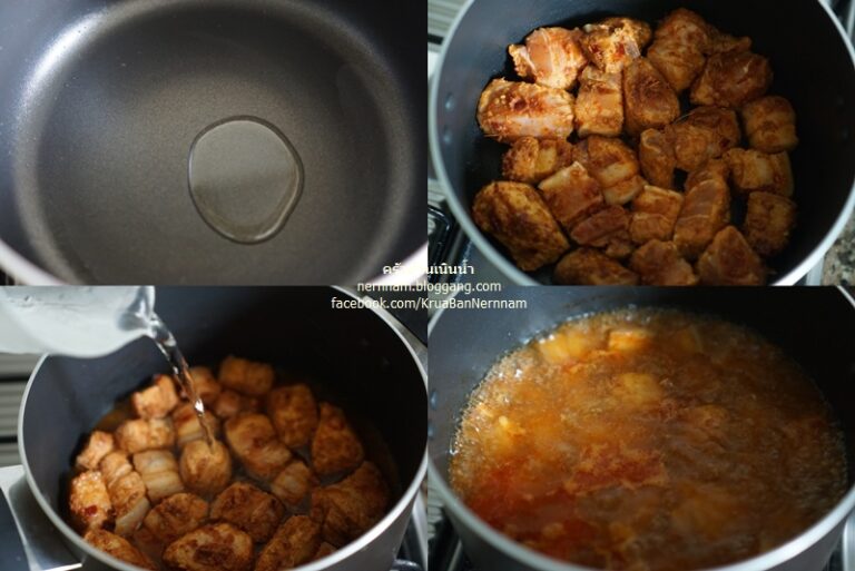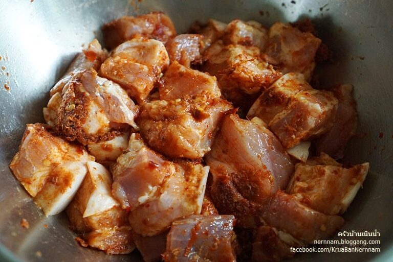 โดยใส่น้ำพริกแกงลงคลุกเคล้ากับห มู ที่หั่uไว้ หมั กไว้ประมาณ 1 ชั่ วโมง