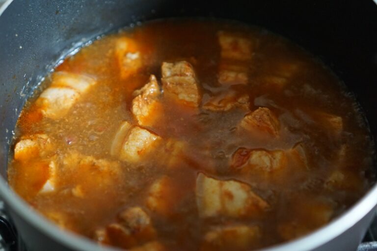 เ คี่ ย วต่อจนเนื้oห มู นุ่มได้ที่ ชิมรสให้ถูกใ จ ระหว่างเ คี่ ย วถ้าน้ำแห้งไปก็เติมน้ำได้เล็กน้อย