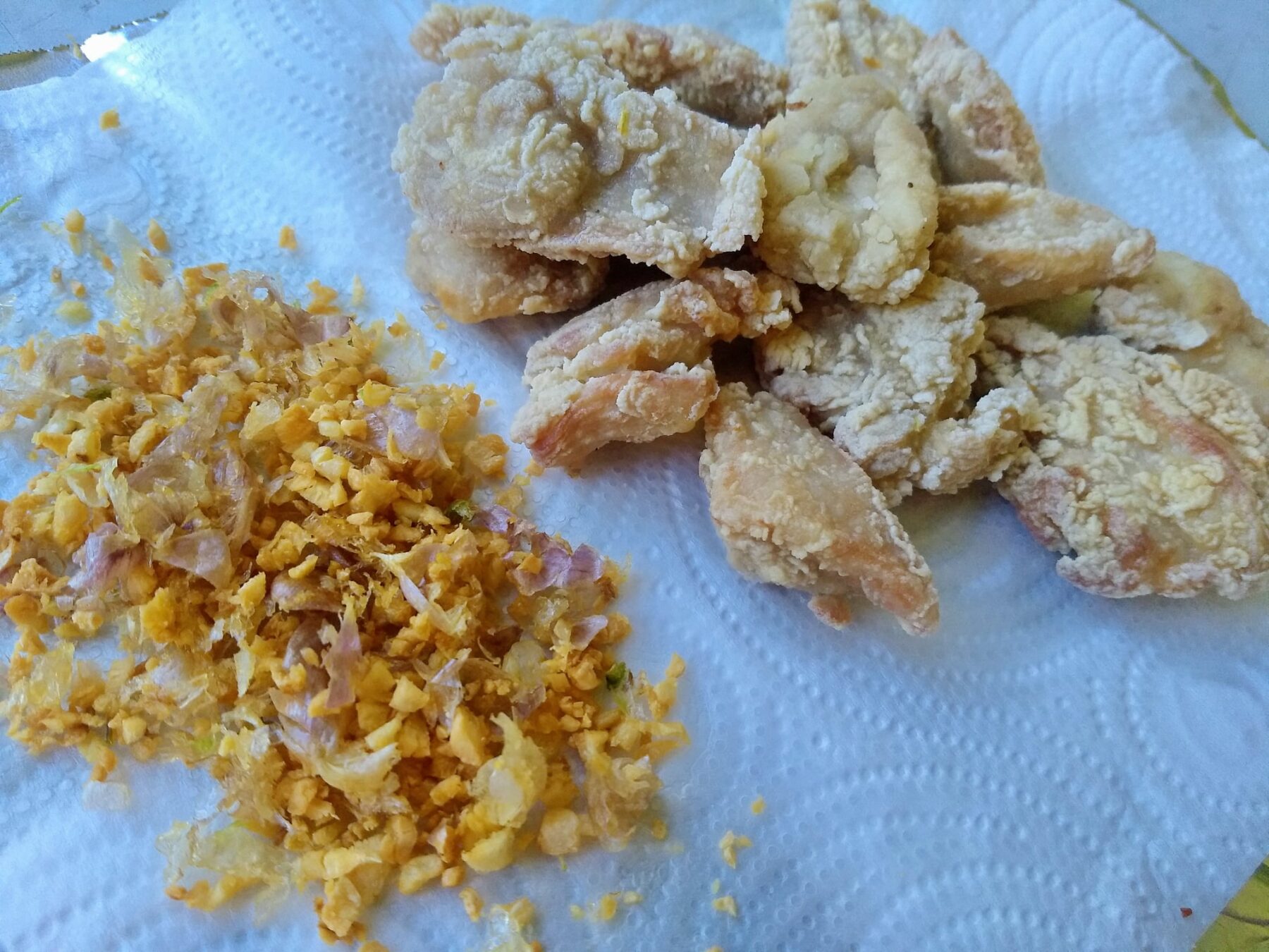 -แล้วค่อยนำไปคลุกแป้งมันเอาลงทอดน้ำมันร้อนๆ เตรียมกะเทียมเจียวไว้โรยหน้าด้วยก็จะดีมาก