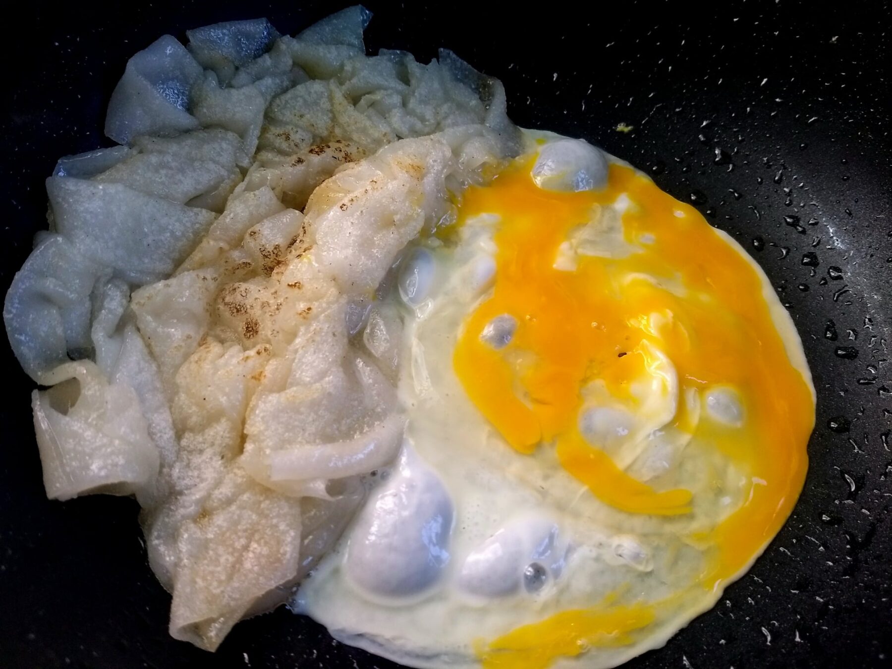 -ต่อยไข่ใส่ลงไปก่อนหนึ่งฟอง แล้วรีบๆผัดคลุกเร็วๆให้เข้ากัน ปรุงรสง่ายๆด้วยซีอิ๊วขาวหรือน้ำปล าตามชอบ