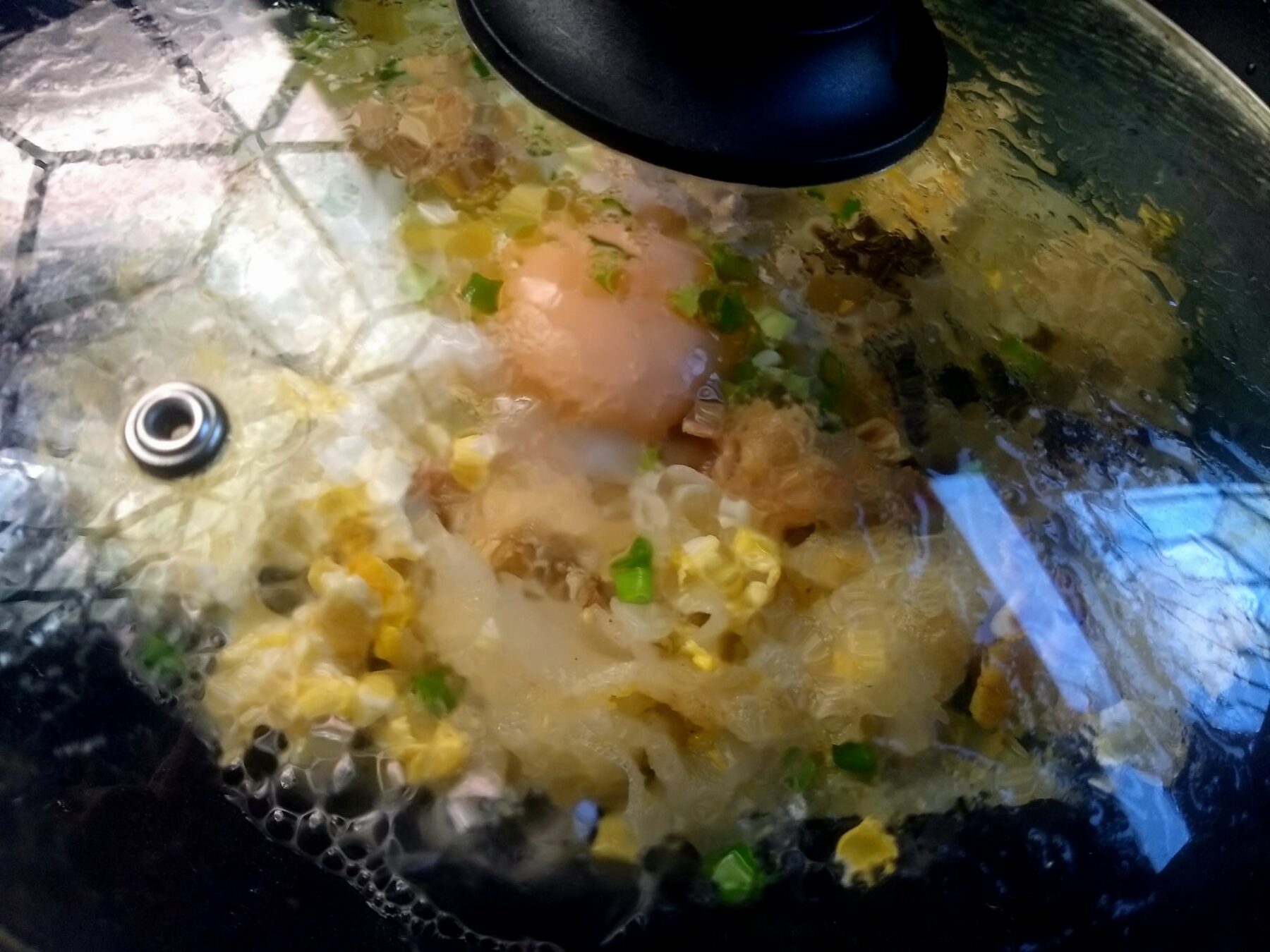 -เกลี่ยเส้นให้เป็นแผ่นทั่วกระทะ ใส่ไก่ทอดลงไปให้ทั่วๆแ ห ว ก รูตรงกลางเล็กน้อย ต อ กไข่ไก่ใส่ลงไปหนึ่งฟอง โรยต้นหอม