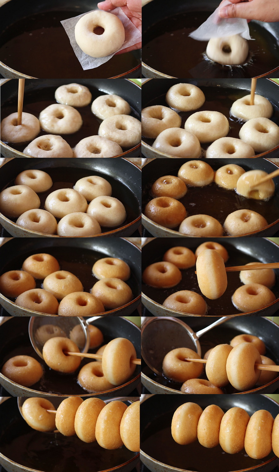 แล้วกลั บอีก ด้านทอ ดจ นสุ กเหลืองทั้ง 2 ด้าน จา กนั้นตักขึ้นพักให้สะเ ด็ดน้ำมันบนตะแกรง จ นโดนัทเย็ นสนิท