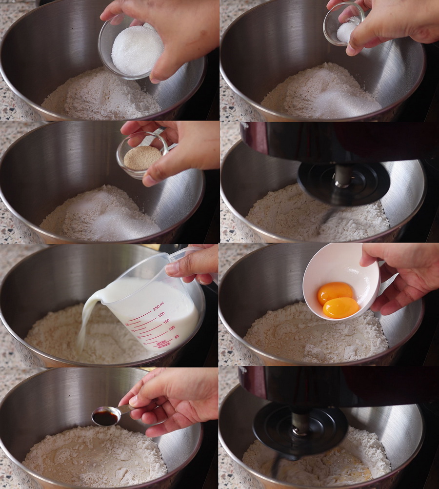 1. ใส่แป้งสาลีเอนกประสงค์(ที่ร่ อนไว้แล้ว)+น้ำต าลทราย+เกลือป่ น+ยีสต์ แล้ว๓ีหรือผสมพอเข้ากันพอเข้ากัน