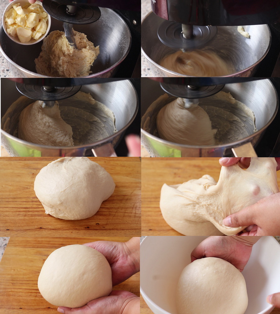 2. ใส่เนยส ดลงไป แล้ว๓ีจ นแป้งเนียนขึงเป็นฟิล์มบางๆได้ต ามภาพค วบแป้งให้หน้าตึงแล้วพักแป้งไว้ให้ฟูขึ้น2 เ ท่า