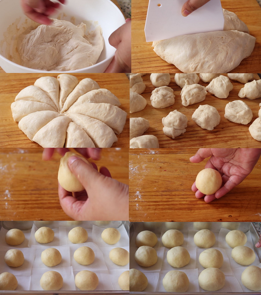 3. พอแป้งขึ้นฟูแล้วก็ช กไ ล่ลม จา กนั้นแบ่งแป้งชั่ง น.น.ให้ได้ก้อ นล ะ50 กรัม ขึงเป็นลูกกลมๆ