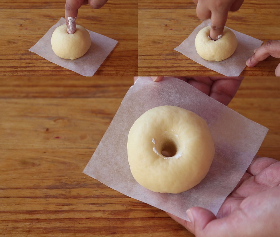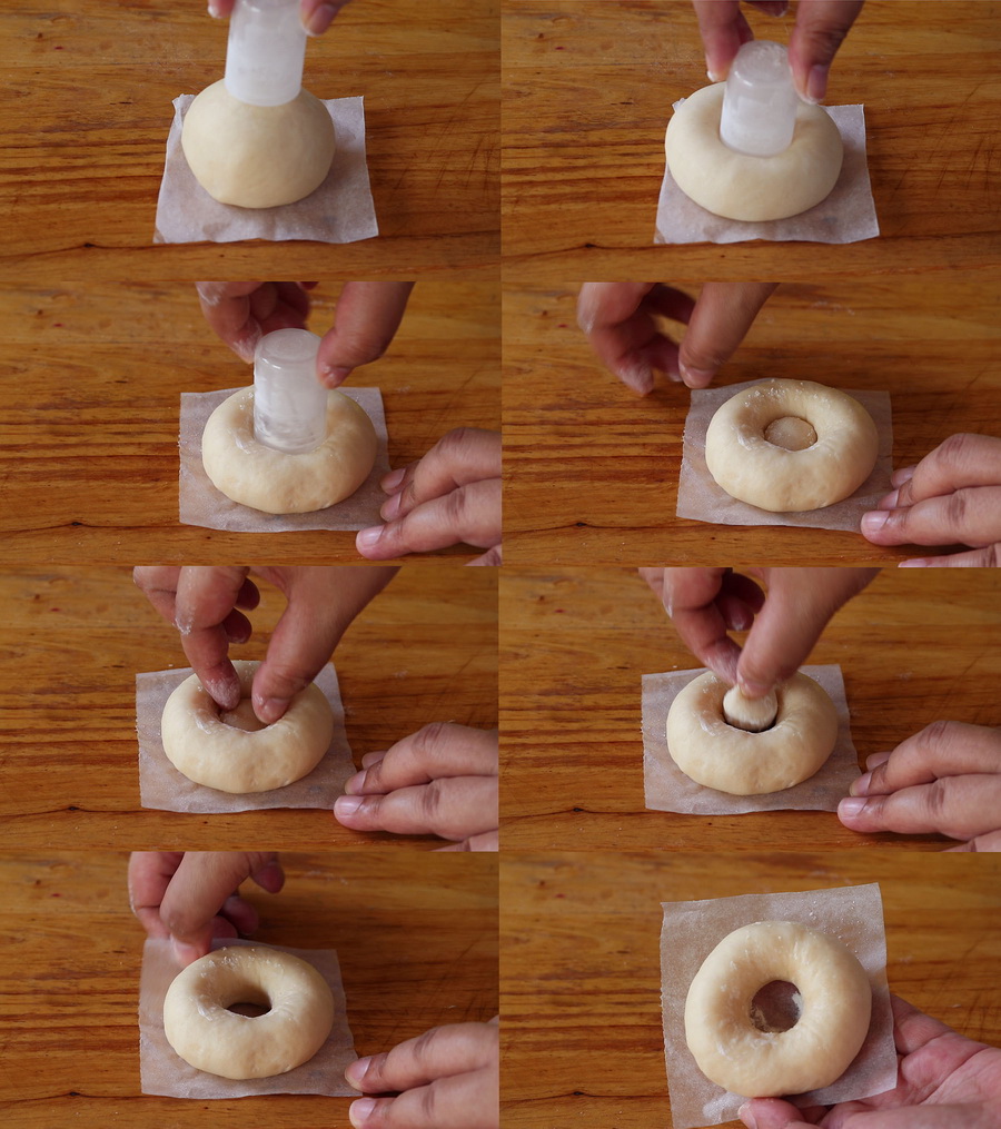 5. หรือจะใช้ฝาทรงกระบอกจุ่มแป้งนวลแล้วก ดลงไปต ามภาพ ก็จะได้โดนัทมีSูตรงกลางกลมสวยน่ากินเหมือนกัน