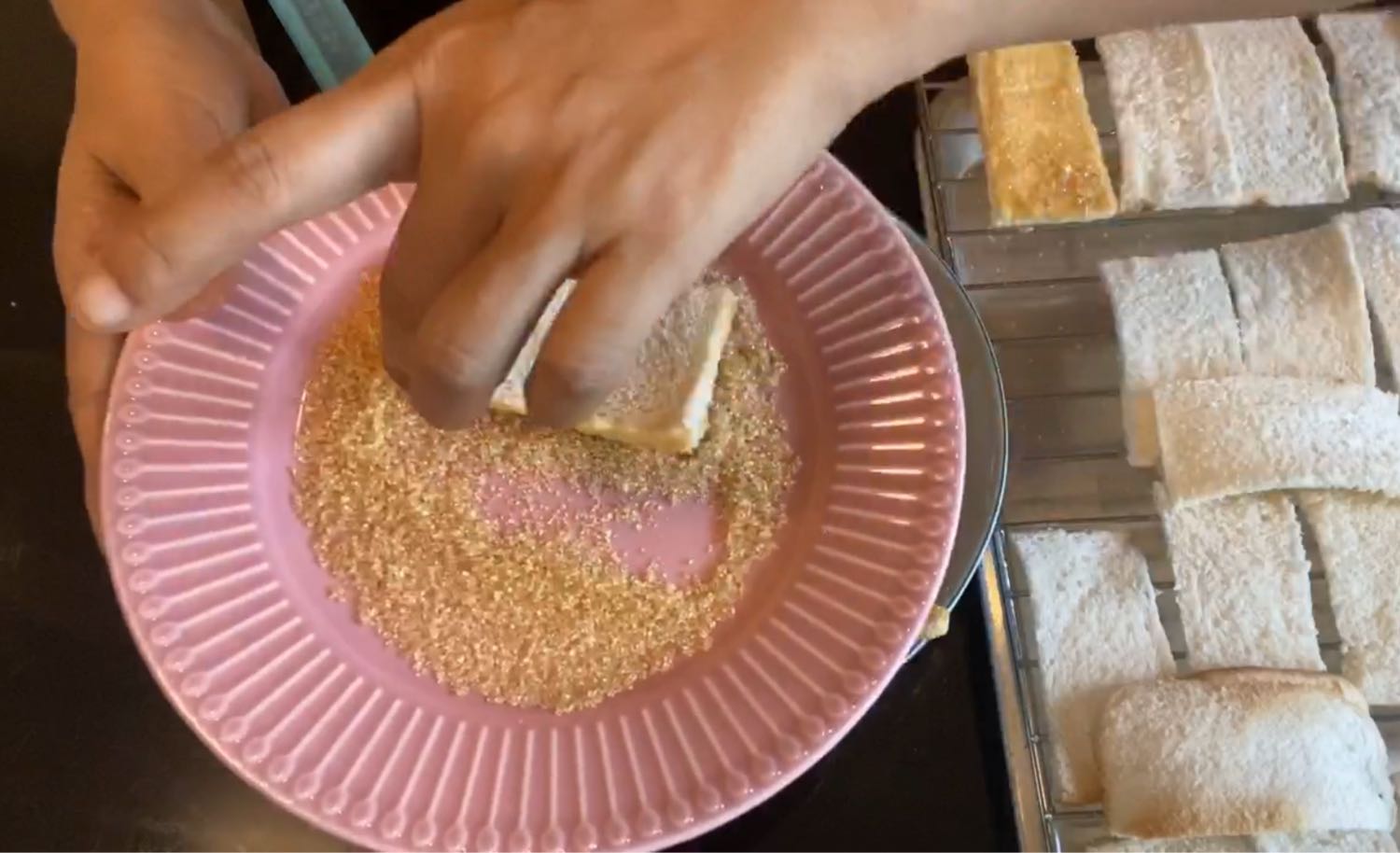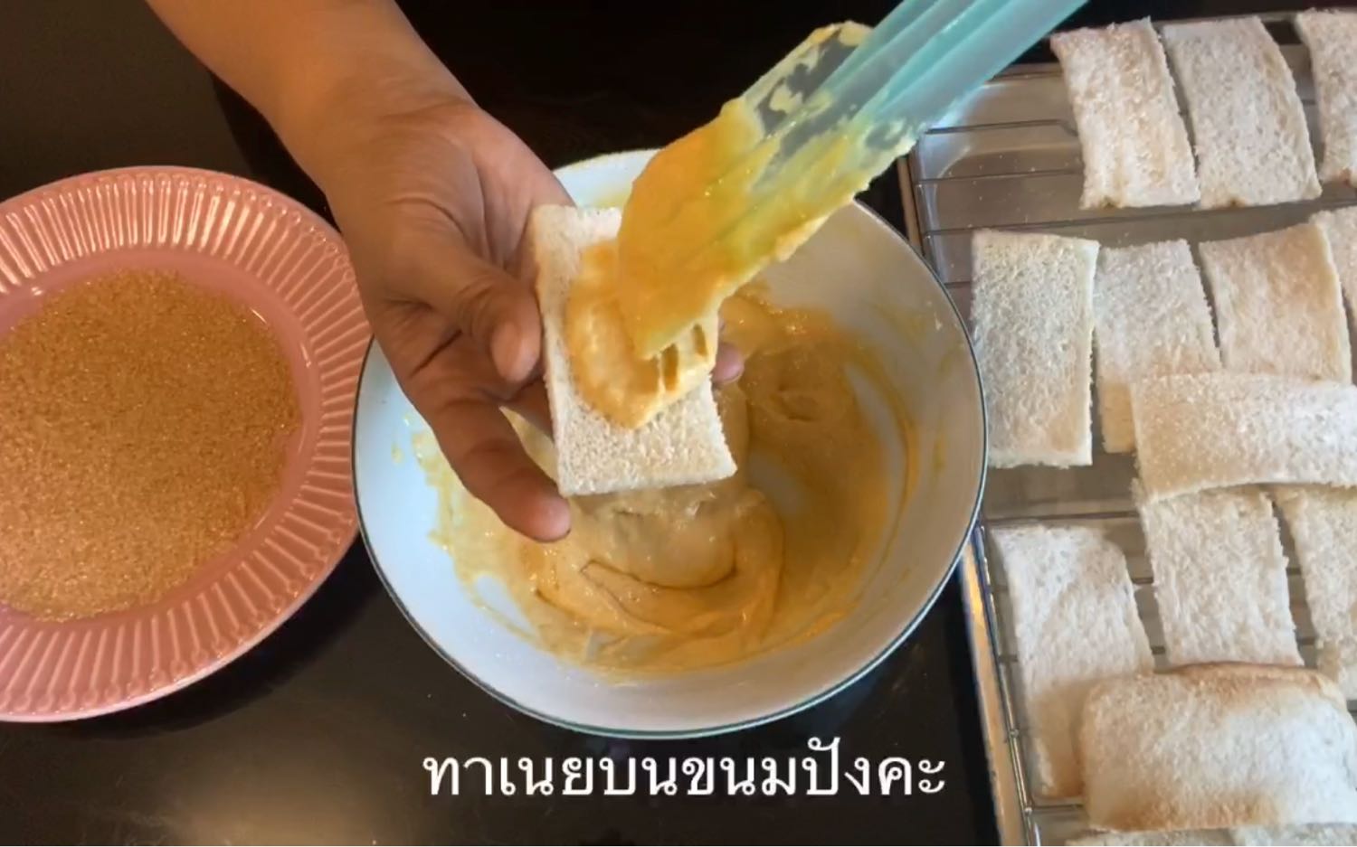 -พอผสมกันเรียบร้อยแล้ว ทาขนมปั งแล้วตามโรยหน้าด้วยน้ำตาลทราย