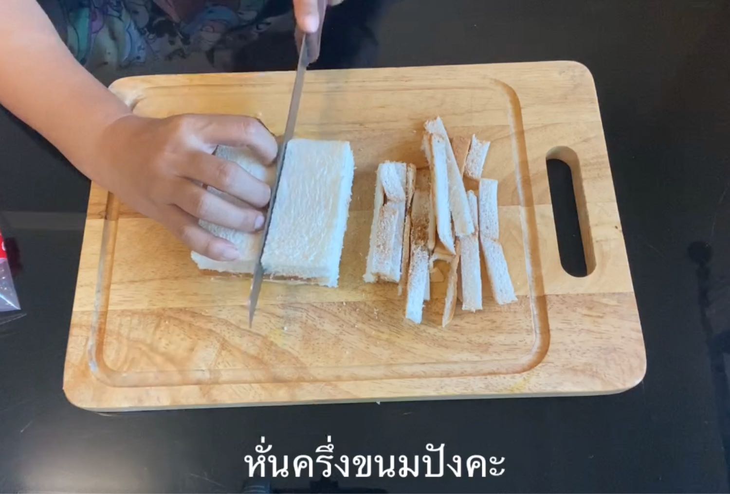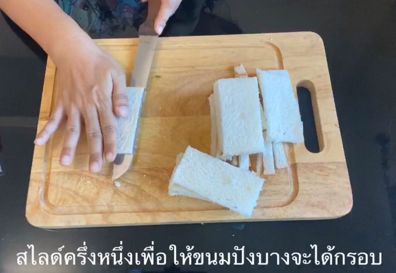 -นำขนมปั งมาตัดขอบแล้วแบ่งครึ่ง สไลด์1/2 ของขนมปั งคะ