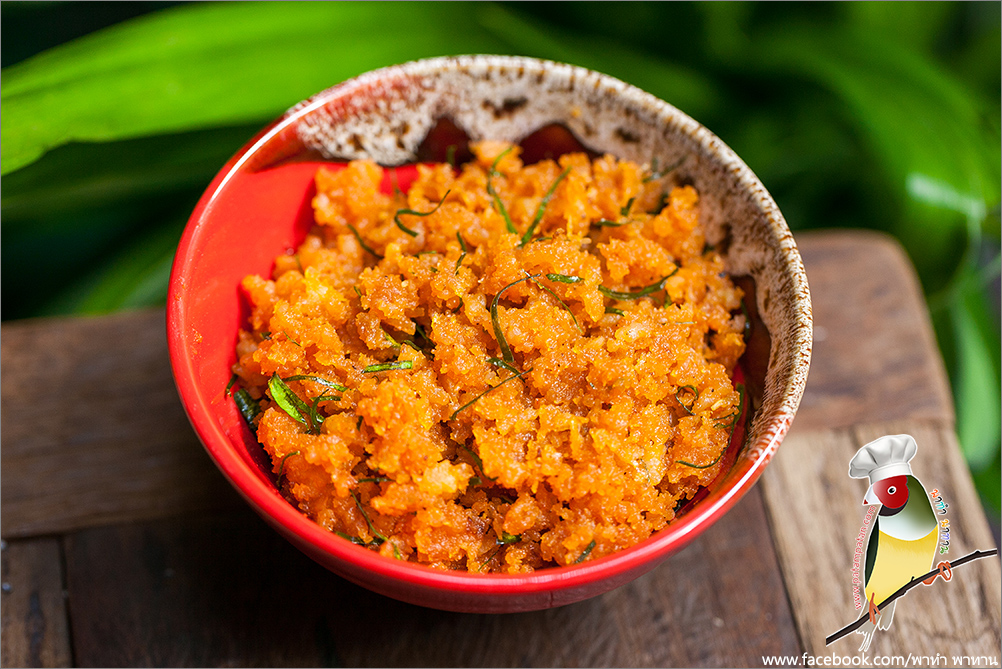 -เมื่อมะพร้าวเป็นสีส้มแล้วให้เราไปคั่ วในกะทะจนแห้งก็จะได้มะพร้าวที่มีสีส้มแล้วค่ะ