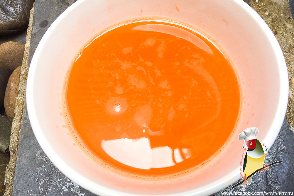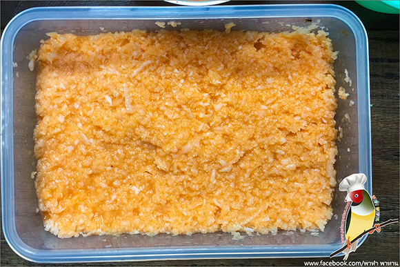 -เทน้ำแครอทลงไปเพื่อให้มะพร้าวขู ดเป็นสีส้ม(ต้องแช่ก่อนแบบนี้ค่ะ เพราะถ้าใส่แบบขั้นตอนสีผสมอาหารจะทำไม่ได้ค่ะ)