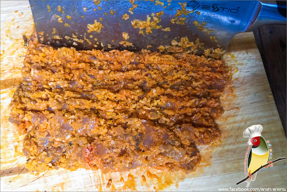 -จากนั้นเราเอาเ นื้ อกุ้งสั บรวมกับเ นื้ อมะพร้าว เพื่อจะได้เป็นเ นื้ อเดียวกันค่ะ