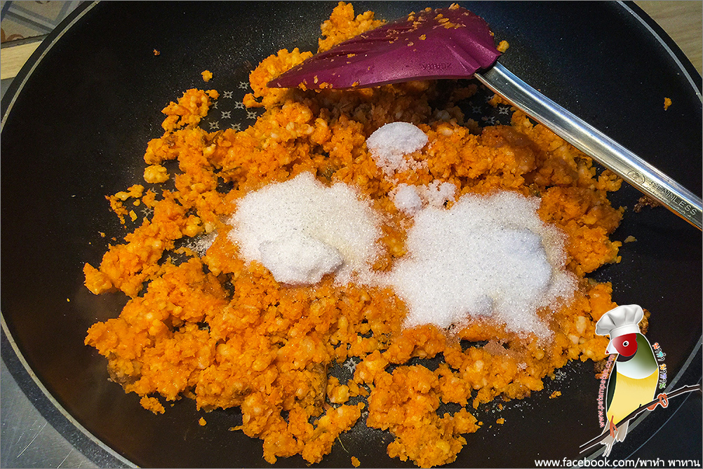-เมื่อเ นื้ อกุ้งสุ กแล้วให้เติมน้ำตาลทรายและเกลือลงไป