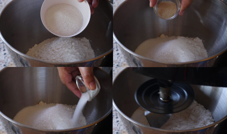 1.ใส่แป้งสาลีเอนกประสงค์(ที่ร่อนไว้แล้ว)+น้ำตาลทราย+เกลือป่น+ยีสต์ แล้วตีหรือผสมพอเข้ากันพอเข้ากัน