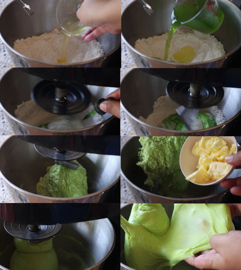 2.จากนั้นใส่ไข่ขาว น้ำใบเตยคั้น และสีผสมอาหารสีเขียวเล็กน้อย ตีพอแป้งจับตัวกันเป็นก้อน ใส่เนยสดลงไป