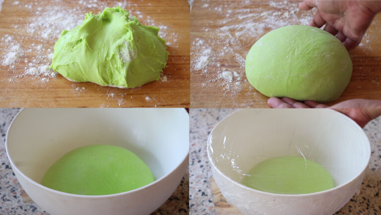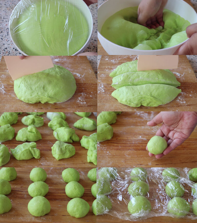 4.พอแป้งขึ้นรฟูแล้วก็ช กไ ล่ ลม จากนั้นแบ่งแป้งชั่ง น.น.ให้ได้ก้อนละ 50 กรัม ขึ งเป็นลูกกลมๆ แล้วพักไว้ 10-15 นาที