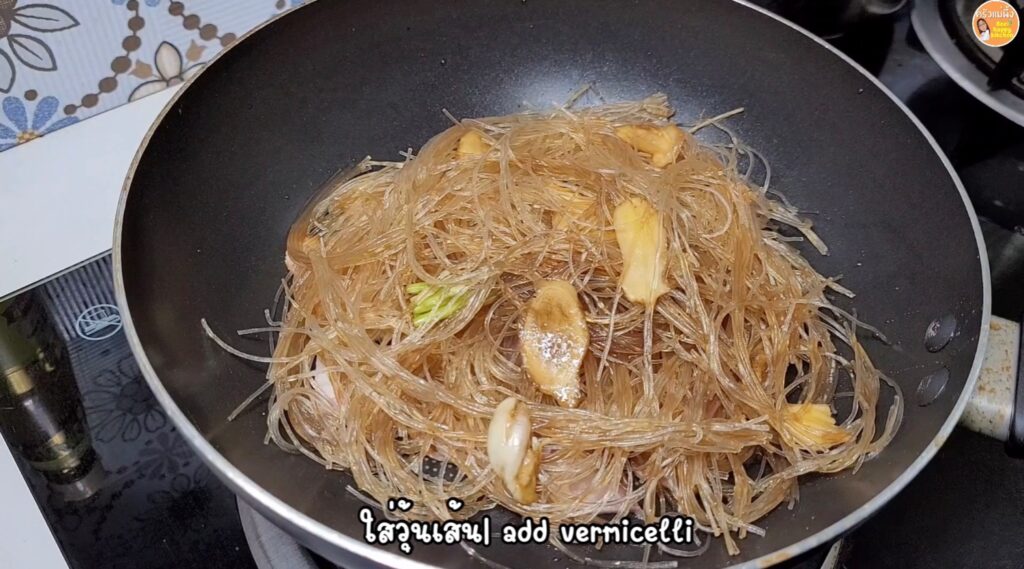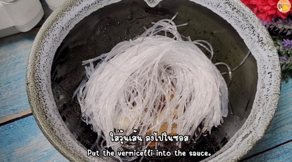 นำวุ้นเส้นที่แช่นน้ำจนนิ่มแล้ว ไปค ลุ กกับน้ำซอส จะทำให้วุ้นเส้นเหนียวนุ่ม ไม่แฉะ หoมอร่อย
