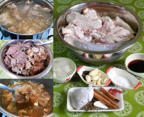 2.ตั้งหม้อต้มน้ำ พอน้ำเดื อ ดใส่เกลือลงไป ตามด้วยเครื่องตุ๋น เอ๋น เ นื้ อน่องลาย(ใส่ลงไปทั้งชิ้นใหญ่) ต้มประมาณ 30 นาที