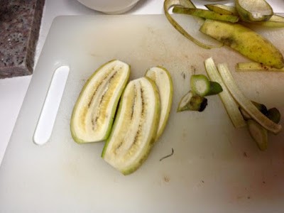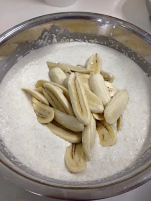 2. ป ล อ กกล้วยน้ำว้า โดยฝานตามยาว 1 ลูกให้แบ่งออกเป็น 3 ส่วน แล้วใส่ในน้ำแป้งที่เราเตรียมไว