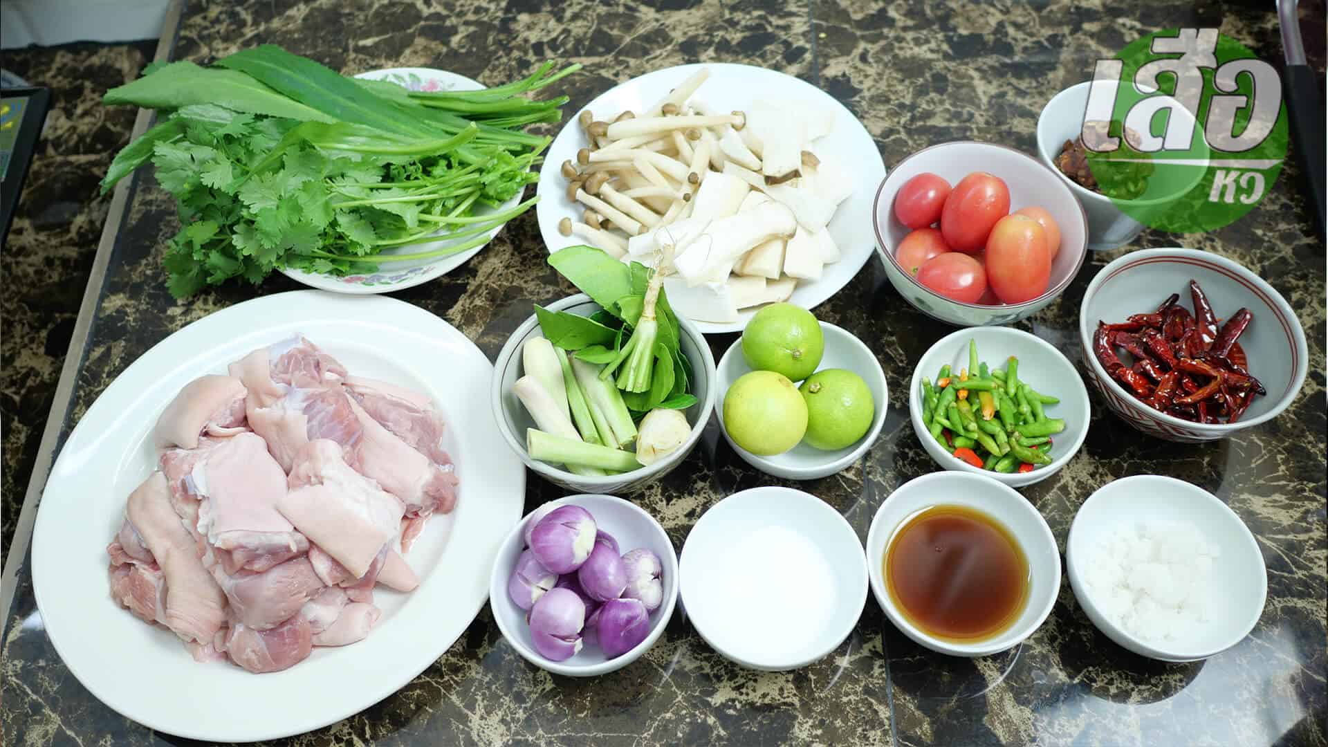 – พอขาหมูเ ปื่ อ ยดี ใส่ข่ า ตะไคร้ หัวหอม กระเทียม พอน้ำเ ดื อ ดอีกครั้งใส่เห็ดนางฟ้า ต้มต่อจนเ ดื อ ด ใส่มะเขือเทศ