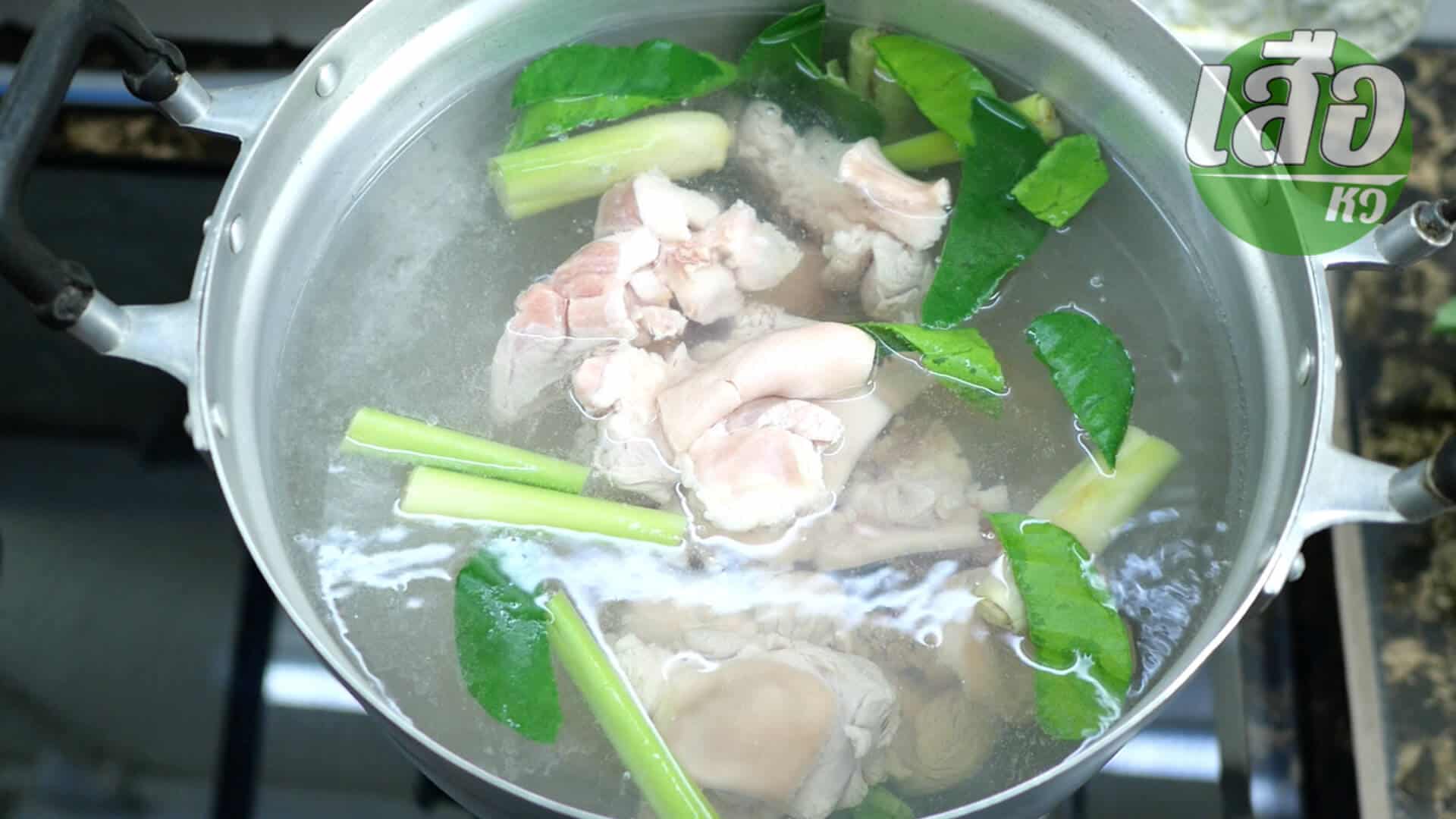– ต้มขาหมู ใส่น้ำให้ท่วม ใสเกลือประมาณ 1 ช้อนช า เ คี่ ย วประมาณ 40 นาที คอยตักฟองออกให้หมด