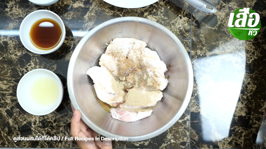 (น้ำมันพืช จะช่วยให้ไก่มีความนุ่ม เวลาทอดก็จะไม่ติดกระทะด้วย) ตามด้วยพริกไทยขาว