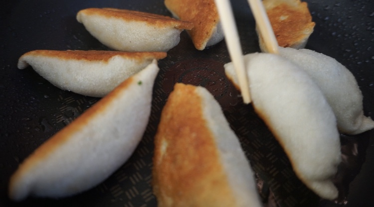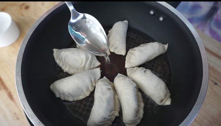 -เมื่อกระทะร้oน ใส่น้ำมัuมะพร้ าวลงไป และวางตัวเกี๊ยวเรียงลงไป รอสักพักให้กระทะร้oนขึ้น หยoดน้ำเปล่า 1 ช้อน