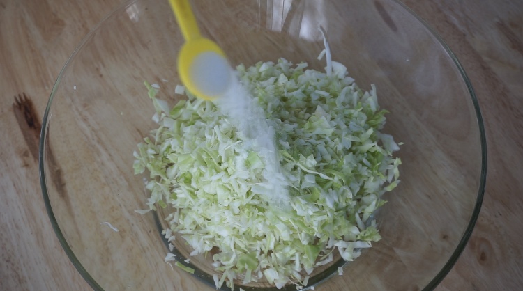 -หั่uและสั บกะหล่ำปลีให้ละเอียด แล้วใส่เกลือลงไป คลุกให้เข้ากันแล้วพักทิ้ งไว้ประมาณ 15-20 นาที
