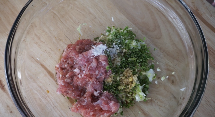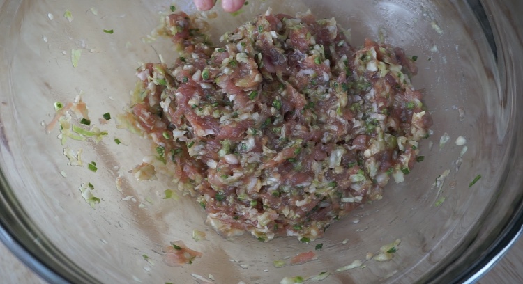-บี บน้ำจากกะหล่ำปลีออก นำมาใส่ไว้ในอ่างผสม ใส่กระเทียม ขิ ง และใบกรเทียมสั บ ต ามด้วยส่วนผสมของไ ส้ทั้งหมด