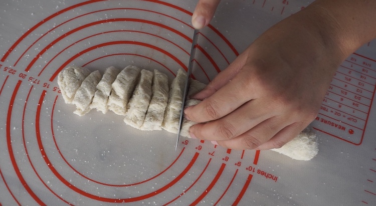 -นำมาคลึงให้เป็นเส้นย าวๆแล้วตัดแบ่งให้เท่ากัน ก้อนละประมาณ 10 กรัม
