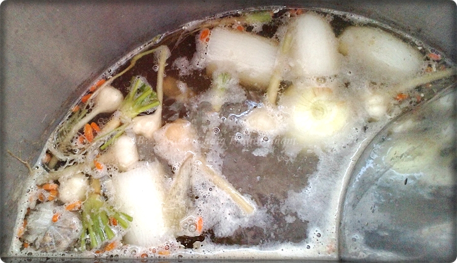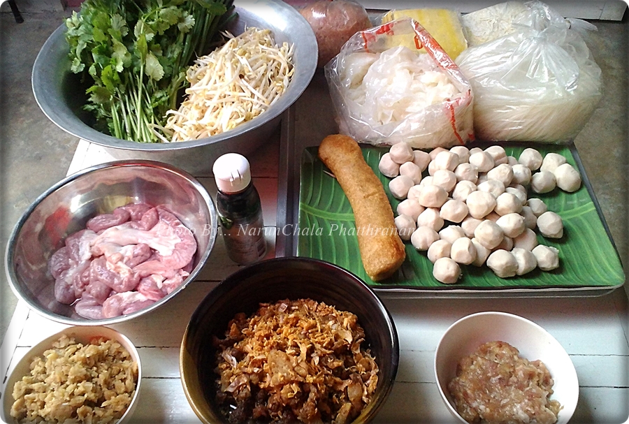1. ตั้งน้ำให้เดืoดใส่เครื่องน้ำซุป ประกอบด้วย เครื่องต้มก๋วยเตี๋ยวน้ำใส เกลือป่น ร ากผั กชี พริกไท ยเม็ด หั วไ ชเ ท้ า