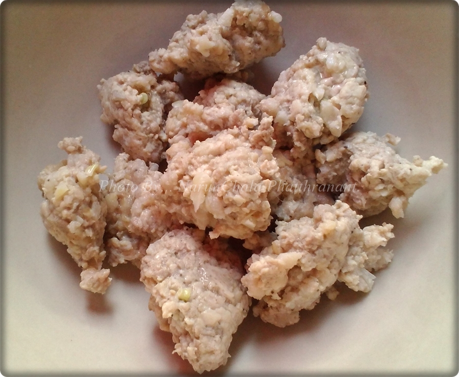 2. หมักห มูสั บด้วยกระเทียมพริกไท ย ซีอิ๊วข าว เล็กน้อย ปั้นเป็นก้อนกลม นำไปต้มในน้ำเดืoดแล้วพักไว้