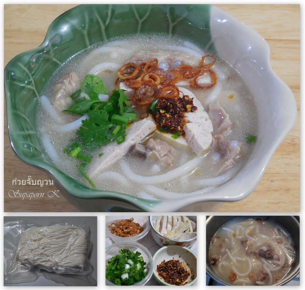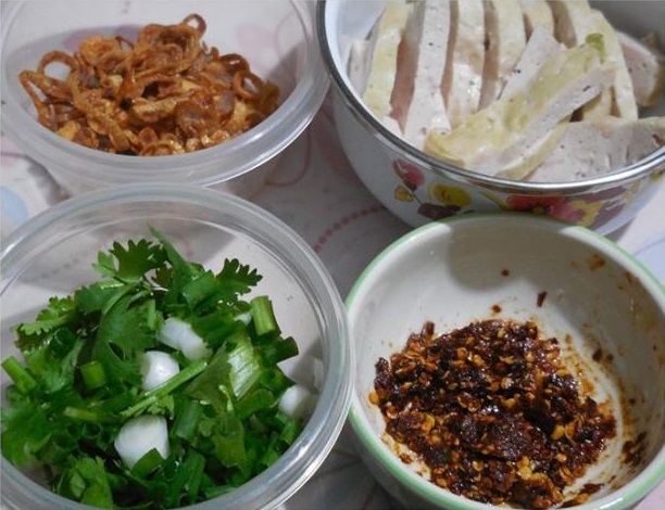 – เวลาจะทาน ตักใส่ถ้วย ใส่หมูยอ หอมเจียว พริกป่น โรยหน้าด้วยต้นหอม ผักชี