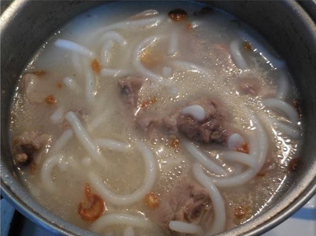 – หลังจากนั้นใส่เส้นข้าวเปียกลงไป ปรุงรสด้วยน้ำปล า ต้มประมาณ 15 นาที หรือจนเส้นสุ ก