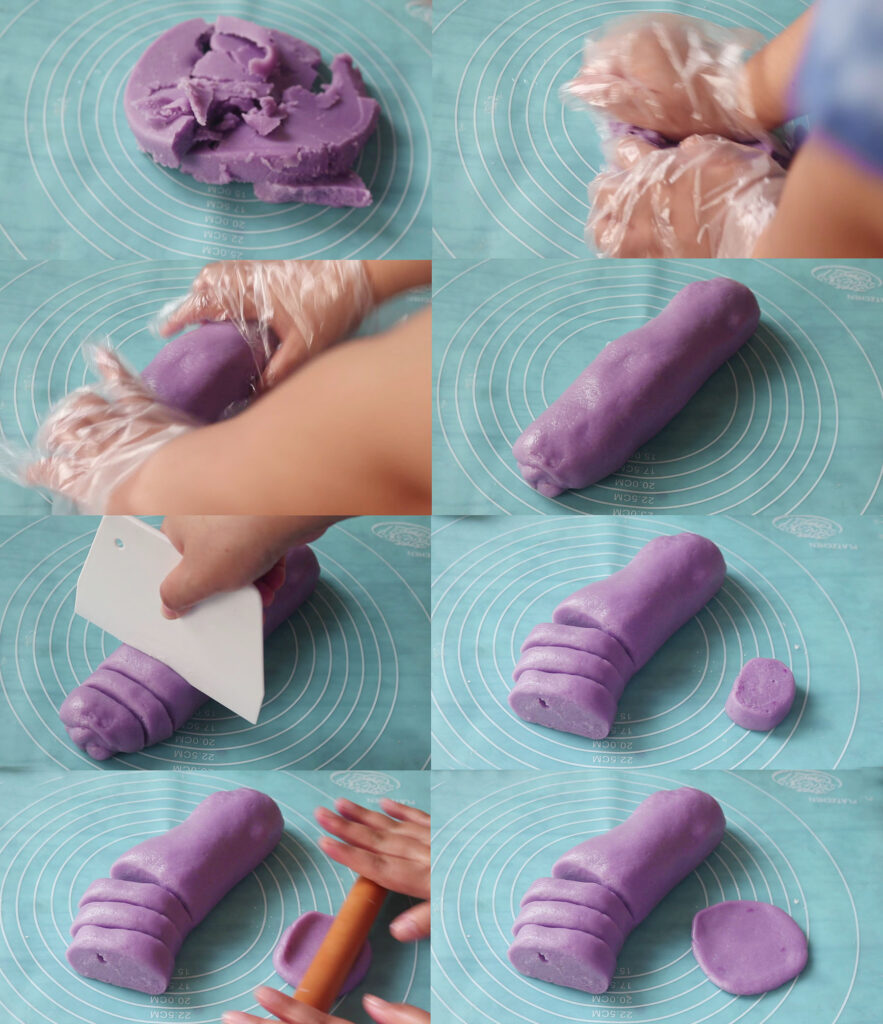 นวดและทำบนแผ่นซิลิโคน ถ้าทำบนเขียงต้องโรยแป้งนวลด้วยนะคะแป้งจะได้ไม่ติดเขียง ถ้ามีถุงมือก็จะทำให้ง่ายต่อการปั้นค่ะ