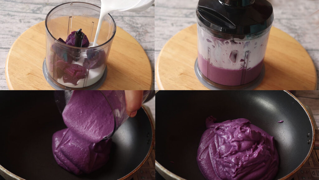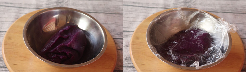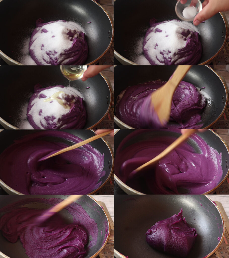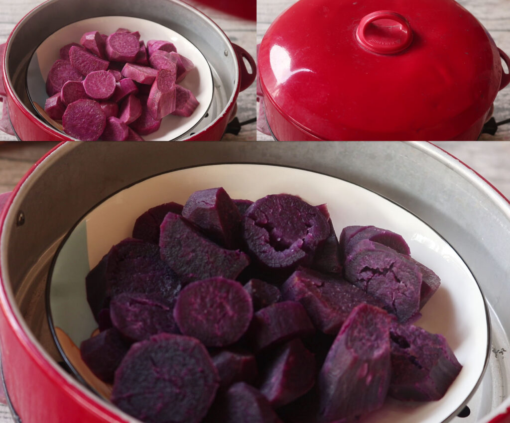 1.เริ่มทำไส้มันม่วงค่ะ นำมันม่วงมานึ่งจนสุ ก