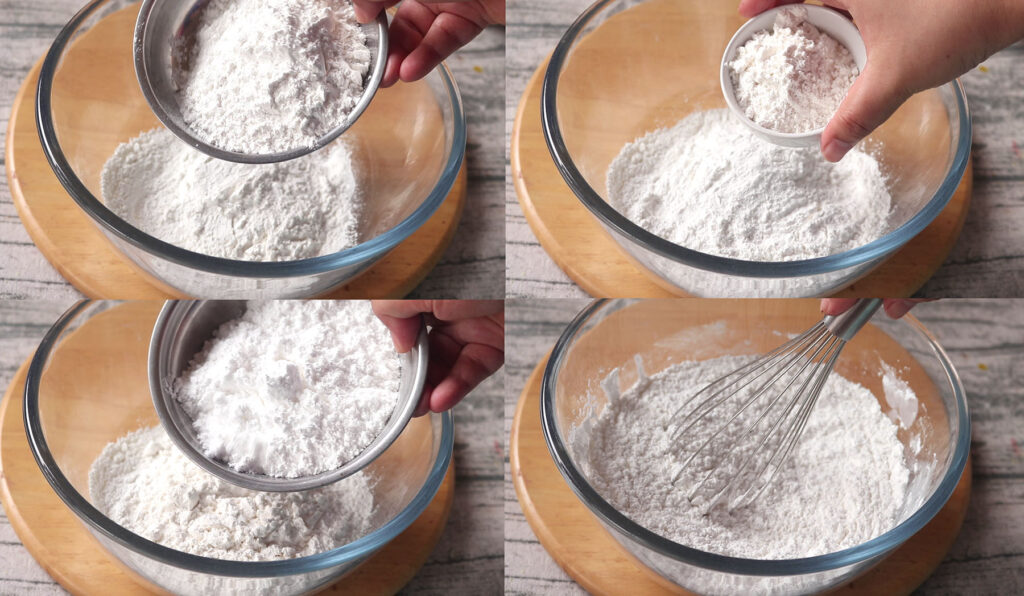 5.ผสมแป้งข้าวเหนียว แป้งข้าวเจ้า แป้งตั้งหมิ่นหรือแป้งสาลี น้ำตาลไอซิ่ง คนให้เข้ากัน