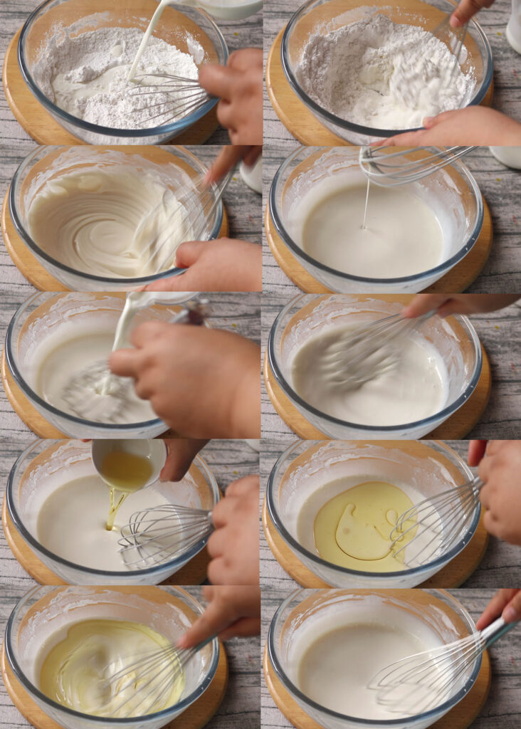 6.เติมนมจืดลงไป แบ่งใส่สัก 2 รอบนะคะ คนให้เข้ากัน เติมน้ำมันรำข้าว