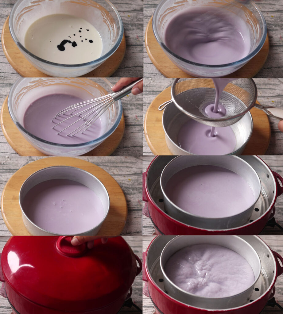 7.ผสมสีม่วงลงไปเล็กน้อย นำมากรองใส่ในชามหรือพิมพ์ที่เตรียมไว้ แล้วนำไปนึ่งประมาณ 15-20 นาที พอนึ่งเสร็จแล้ว ก็พักให้เย็นลง
